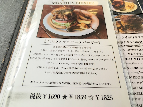 さて9月キングスエイトダイナーさんのマンスリーバーガーは「ナスのアラビアータバーガー」。