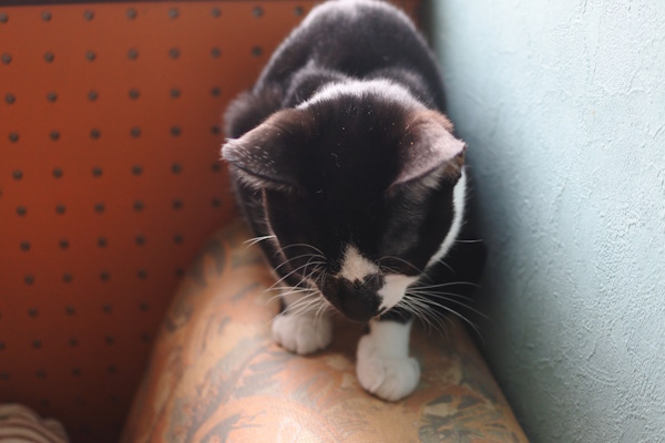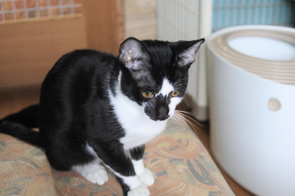 さて、こちらは奥の横の間に引っ越した、里親さん募集中の額バットマンマーク猫。