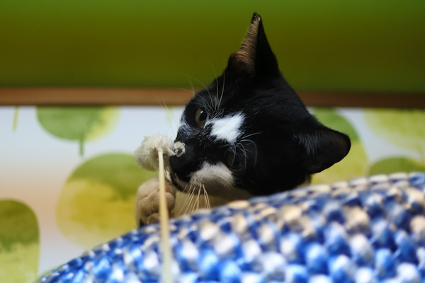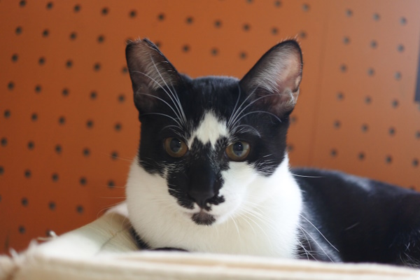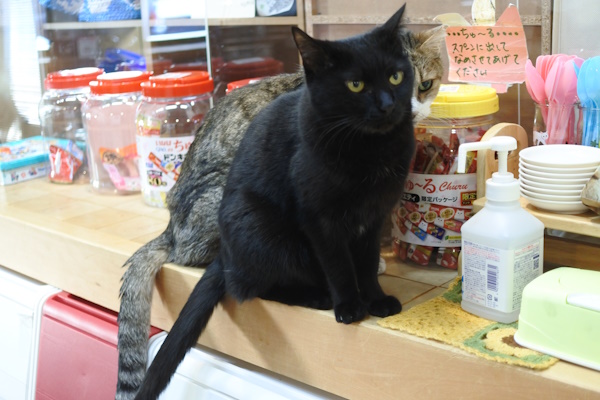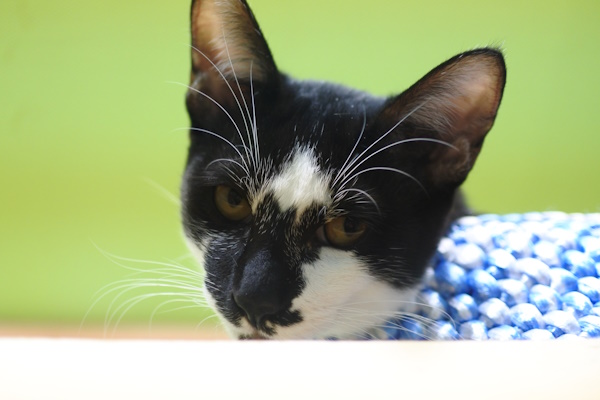 同じ部屋で里親さんを募集中のハチワレ(バットマン)親子は、2匹が引き取られた後に高い場所に避難(?)しました。