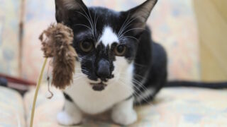 奥の間で里親さんを募集中の額にバッドマン(と勝手に呼んでいる)の黒白仔猫。順調に遊び盛り、スリムに育っています。可愛いんやってのぉ、と思ったらcat villageさんまでご連絡を。体力を持て余しているのさ、というか、紐であればなんでもいい...