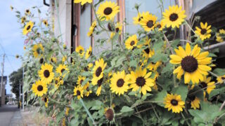 10月になっても咲いているというか、9月10月の方が元気に咲いています。珍しいのかなぁと思って調べてみたら、そうでもなく秋咲きというか遅咲きの向日葵は全国各地で観られるようです。狭い花壇なので出来るだけ道路にはみ出さないように、紐でまとめて...